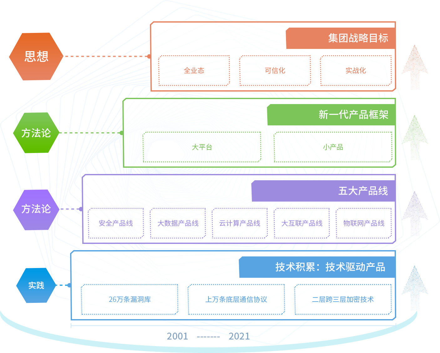在一创20年的积累下,秉承着四层企业战略发展框架下已经研发覆盖网络安全、大数据、云计算、区块链等领域十几大类、几十小类的丰富产品体系,构建业界领先的整体安全解决方案。
