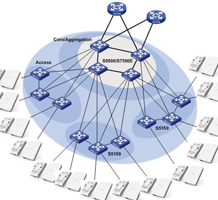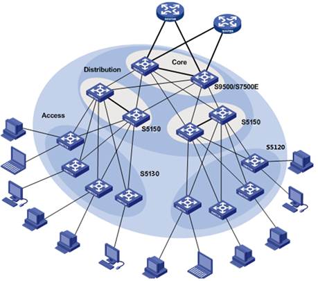S5150EI系列以太网交换机提供100/1000/2.5GBase-T自适应以太网端口或10GE SFP+光口、10GBaseT电口。在企业网中,可以作为L2+万兆小汇聚;在城域网或者行业用户中,向下可以提供2.5G PoE接入或汇聚万兆上行接入交换机,向上可以通过万兆光纤或者链路聚合汇聚到大容量的L3交换机。