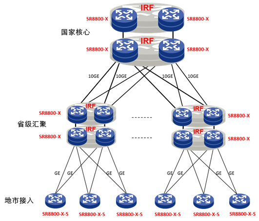 国家级广域网由于地域上覆盖的广阔性,对网络设备的可靠性和安全性要求极高,SR8800系列可以作为国家核心和省级汇聚节点。为了保证网络的安全性,在国家核心、省级节点采用上下行设备分开的设计架构;省级和地市节点同时作为城域网汇聚接入、专线汇聚、窄带接入。