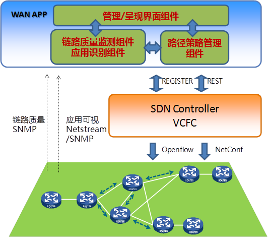 广域网SDN解决方案可以实时动态的收集链路质量状况如链路利用率、时延、抖动等,设备集成的DPI功能会实时上报业务类型,WAN APP动态的为特定应用选择最优的端到端路径,并通过Netconf或Openflow方式,将最优路径策略下发至路由器上。通过实施广域网SDN解决方案,可以减少网络的管理成本,充分调度网络资源;在网络拥塞或者抖动严重的情况下动态调节资源;同时能够实现增值服务和附加业务。