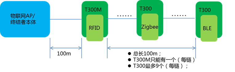 ● 每个串行的链式结构的第一个模块必须为T300M,后续串接的模块全部接T300模块。
