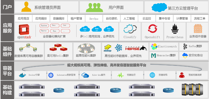 一创 CloudOS云操作系统采用业界先进的微服务架构,将自身的业务组件封装在不同的Docker容器中,并通过Kubernetes对Docker容器进行管理和编排。Kubernetes基于RAFT算法的集群特性和自我修复机制为一创 CloudOS的高可用特性提供了保障。通过对于管理进程容器化部署,实现一创 CloudOS云操作系统的平滑扩展和平滑升级。