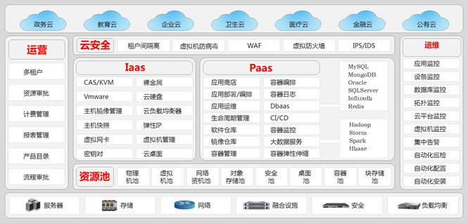 一创 CloudOS云操作系统具有强大的资源抽象和提供能力,能够将数据中心中IT资源以云服务的方式向用户提供,一创 CloudOS云操作系统可以将传统数据中心中计算、网络、存储、安全、应用等资源作为云资源向用户发布,可以向用户提供的X86虚拟机、PowerVM虚拟机、云硬盘、云防火墙、防病毒、云负载均衡、云网络、云数据库、公网IP、裸金属服务器、镜像服务、大数据平台、云桌面、应用服务、DevOps、微服务等云资源和服务。