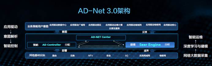 AD-NET 3.0同以往版本相比有两处最大的不同:一是感知,网络会收集前端应用的意图或者机器的意图;二是分析,基于AI的分析平台将前端收集的数据通过一系列的算法做相关的分析,再跟控制器联动形成分析、决策、自动化下发和优化联动的完整方案。