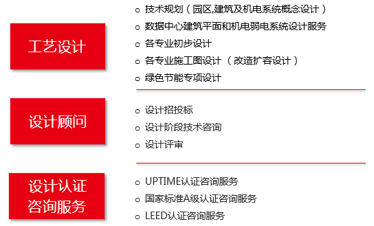 一创的数据中心工艺设计服务在数据中心行业内处于领先地位,率先引入了连续制冷和自由冷却等新的节能理念,并实施了多项转轮热回收、新风制冷、液冷等先进节能技术的工艺设计。数据中心工艺设计服务包含数据中心园区规划、数据中心平面布局、工艺设计、供配电配电方案设计、空调动力方案设计、智能化方案设计、给排水消防设计、绿色节能专项设计、设施改造扩容设计服务、LEED认证服务、UPTIME认证服务、数据中心三联供方案设计咨询。